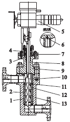 9.閥蓋10.壓套11.密封填料12.上閥座13.閥體
