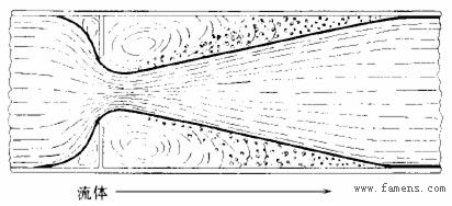 圖1就是一個(gè)在節(jié)流孔后產(chǎn)生空化作用的示意圖。許多氣泡集中在節(jié)流孔閥后,自然影響了流量的增加,產(chǎn)生了阻塞情況,因此,閃蒸和空化作用產(chǎn)生的前后的計(jì)算公式必然不同。在產(chǎn)生空化作用時(shí),在縮流處的后面,由于壓力恢復(fù),升高的壓力壓縮氣泡,達(dá)到臨界尺寸的氣泡開(kāi)始變?yōu)闄E圓形,接著,在上游表面開(kāi)始變平,然后突然爆裂,所有的能量集中在破裂點(diǎn)上,產(chǎn)生極大的沖擊力