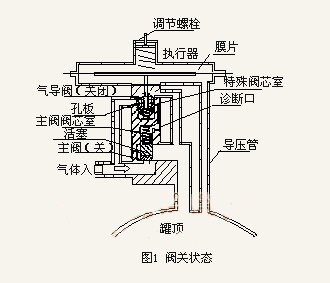 如圖1所示,當?shù)忾y關閉時,主閥的活塞是在一個密封室內(nèi),當儲罐壓力等于或大于設定的壓力時,膜片就被向上頂起,氣導閥在彈簧的作用下向上移動,把氣導閥上的密封圈緊緊壓在閥座上,關閉了控制氣的進口,同時特殊閥芯室的壓力增加并接近氮氣總管的壓力,此壓力通過內(nèi)部通道,從特殊閥芯室傳到主閥閥芯室。主閥的活塞就處于氮氣總管壓力的作用,由于主閥閥芯上、下所受氣體壓力平衡,所以主閥閥芯在自重和彈簧的作用下將閥門緊密關死。