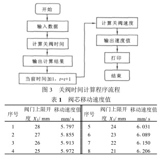 由于采用手工方法計(jì)算工作量很大 , 所以采用VB 6 1 0 編程語(yǔ)言計(jì)算 ( 圖3)。計(jì)算得到關(guān)閥時(shí)間t =3 1 62s 。閥芯移動(dòng)速度值如表 1 所示。
