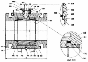 金赤公司使用的DAFRAM球閥在使用過程中發現內漏嚴重,導致合成系統在臨時停車時保不住壓力,對生產系統損失很大。圖2為DAFRAM球閥結構圖,硬密封球閥是雙向密封,只要閥芯閥座接觸良好就應該密封的很好,初步分析為圖2圓圈中所示的505彈簧部件失效,造成閥座不能與閥芯緊密貼合而泄漏。