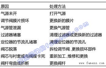在日常生產(chǎn)操作中,調(diào)節(jié)閥不動(dòng)作也是比較常見(jiàn)的故障。造成調(diào)節(jié)閥不動(dòng)作原因和相應(yīng)的處理方法見(jiàn)表1。